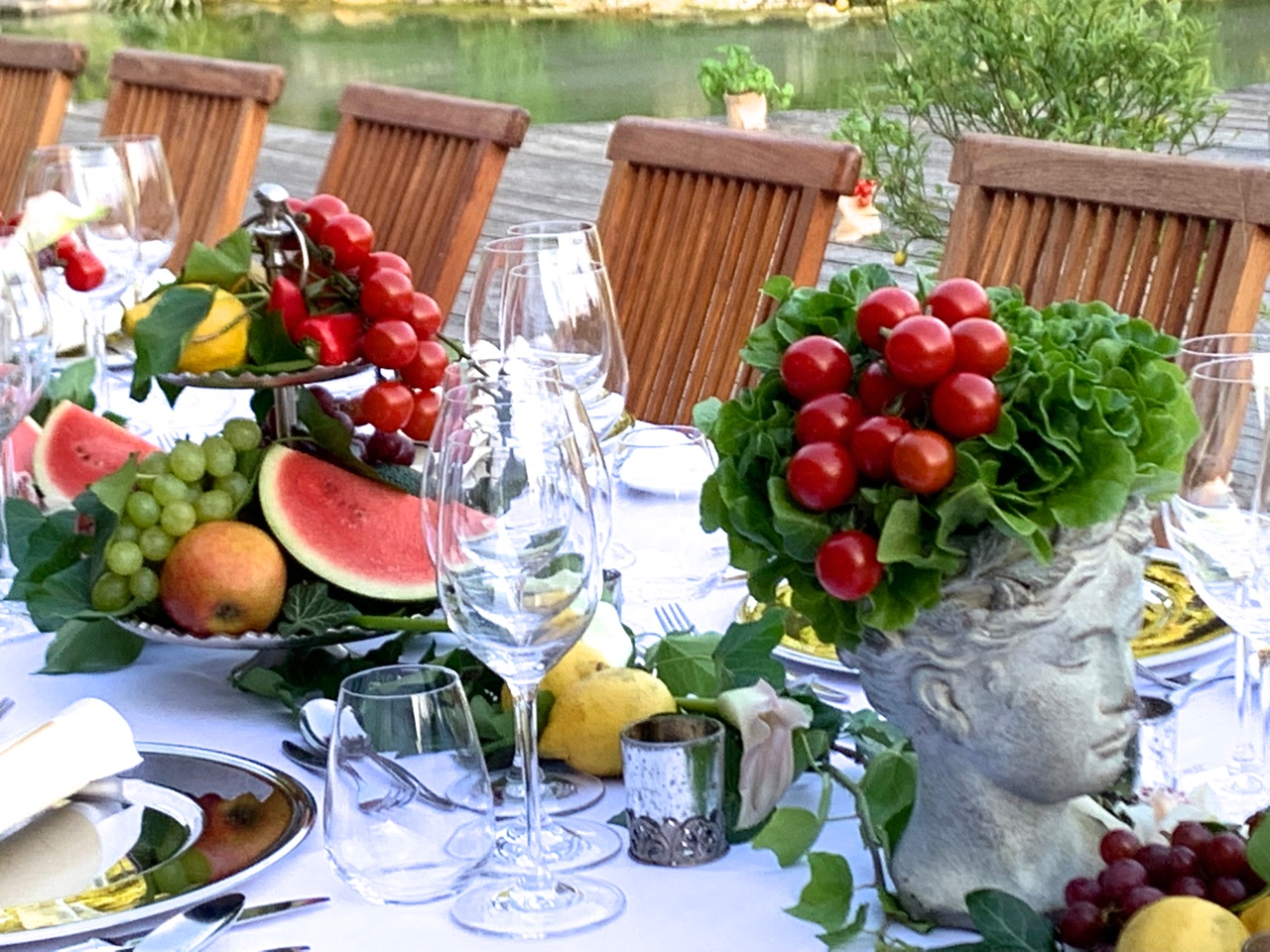 Lustvolles Tafeln im Ambiente des Landgutes Stekovics... ein genussvoller Sommerabend unter historischen Kristalllustern mit Kerzen für erlesene Gäste an der, mit Silberplatztellern und handgeschriebenen Menükarten gedeckten langen Tafel , mit frischen Früchten und Gemüse - vor allem Paradeisern-, Artischoken, Kräutern... Etageren, Amphoren, Altsilberkerzengläsern....Blüten und Ranken.....es gab vieles zu entdecken über dem Tellerrand...