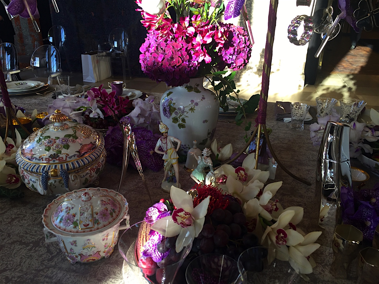 Mit gewählten Objekten der Porzellanmanufaktur Augarten, Leitner Leinen, Lobmeyr Glas und Wiener Silbermanufaktur... mit historischen Kristalllustern und daran abgehängten Silber-, Glas- und Porzellanobjekten und Orchideenblüten. Darunter eine üppigst gestaltete Tafellandschaft mit kleinen Szenen und vielen zu entdeckenden Details, die Geschichten erzählen....