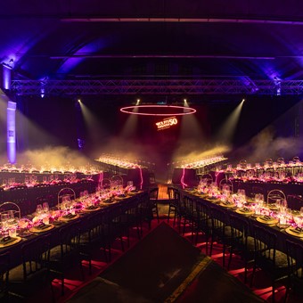 Privater Geburtstagsevent in der Ballonhalle Wien mit 8 6m langen Tafeln mit unzähligen Früchten, Gemüse, pinkfärbigen Blüten, pinkem Lightrope etc....